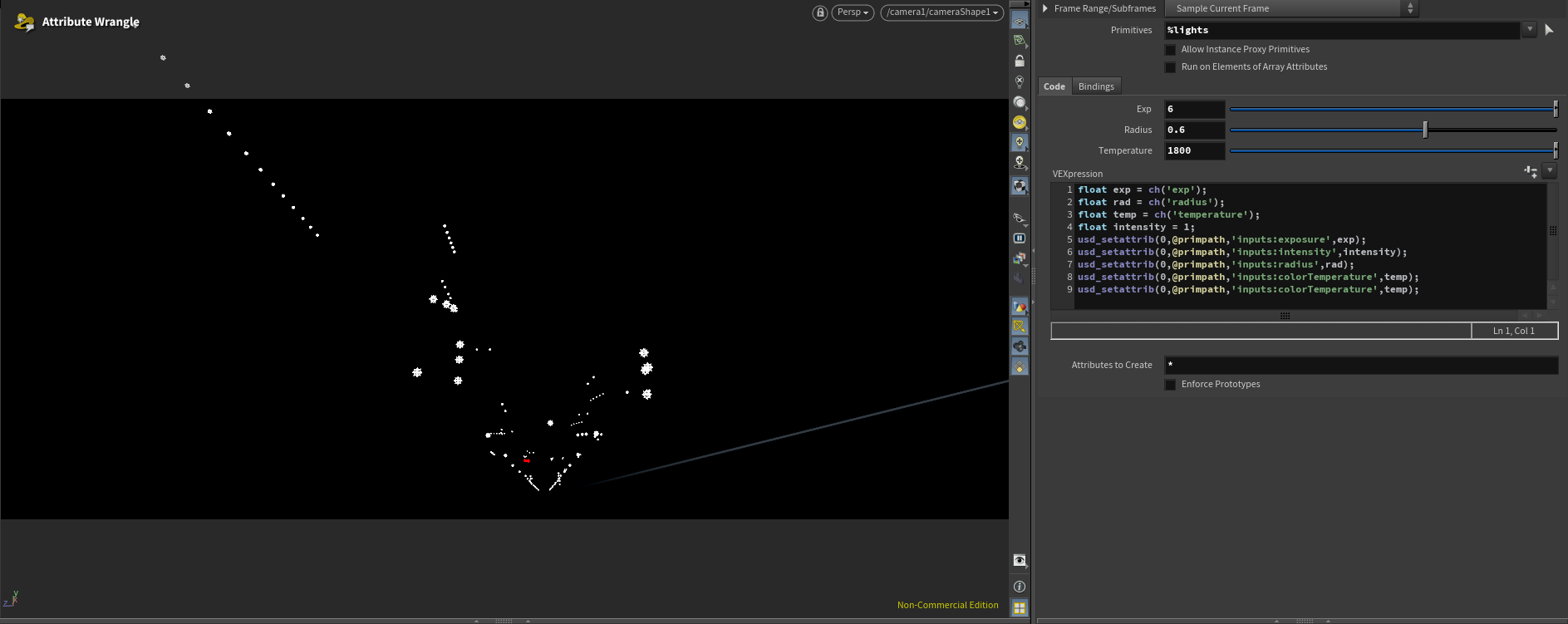 Assets containing lamps were modified with added primitives storing light location and rotation information. I extracted these points in a separate file to scatter lights efficiently. Lights were organized into assembly by the source asset name, providing maximum control with minimal manual effort.