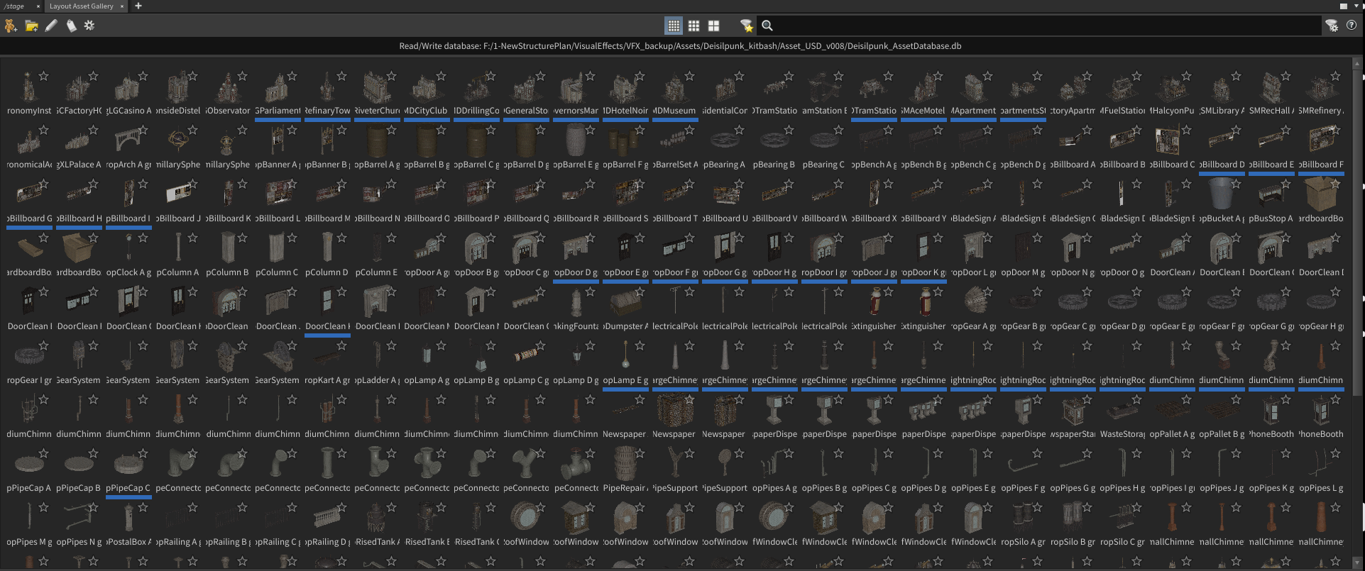 I packed all top-level USD files into an Asset Gallery database. This allows visual selection of assets for layout and environment work using Solaris tools.