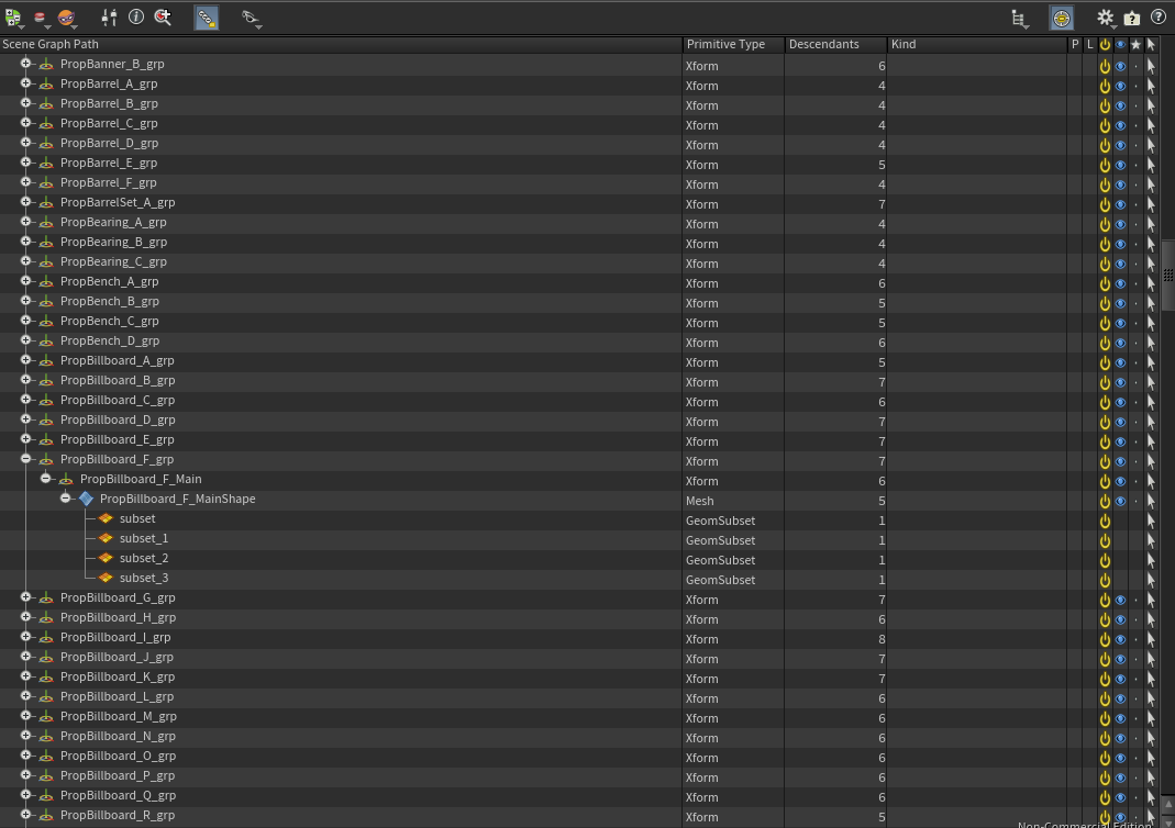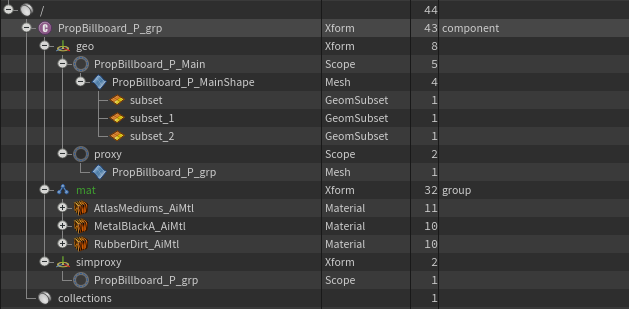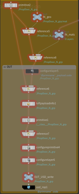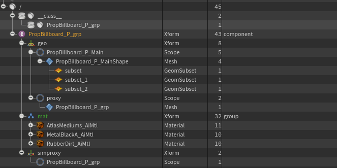 After geometry processing, I switched the top-level node to a component. I repathed the material bindings to exist within the component and created an attribute on the subsets to assist with rebinding materials when referenced back into the component. At this point, the geometry portion was complete. I created a layer break, wrote the geometry USD to its on-disk location, and moved on to material preparation.