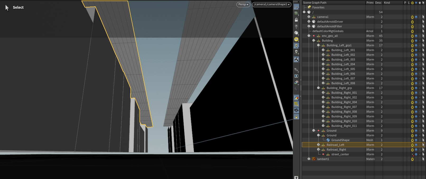 I referenced all saved USD files for each group and constructed the final scene. Additional elements such as fog and train cars were added. With geometry, materials, and lights in place, I configured render settings, AOVs, and prepared the scene for final render.