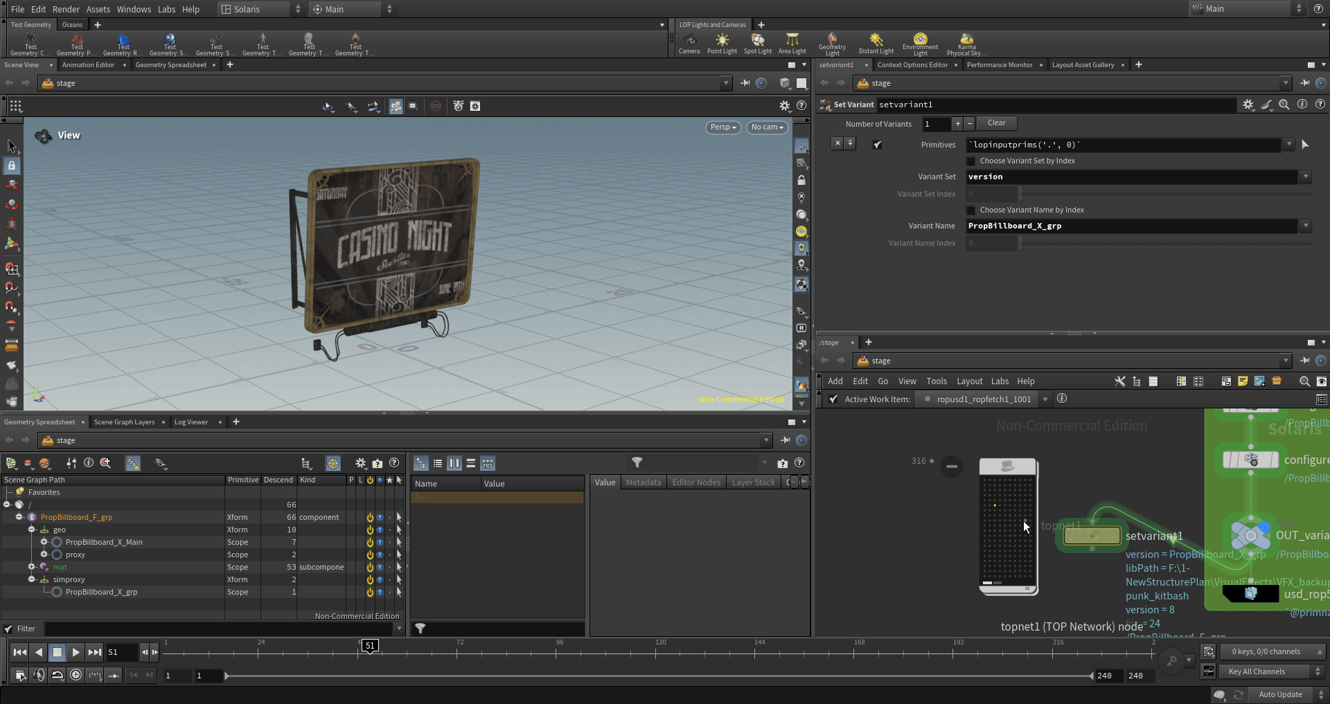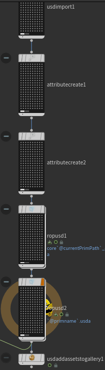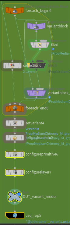 To accomplish this, I processed all assets without variants, writing out what I called a ‘ core’ USD files. Then, in my TOPs network, I processed a second branch to generate top-level USDs containing variants. By analyzing object names, I identified assets with the same base name but different variant letters, referenced their core files, and created variants in the top level file for each object. Metadata was then updated before final export.