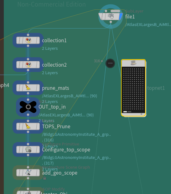 After isolating each object with a TOPs attribute, I added a “geo” scope to hold both render and proxy geometry, keeping them separate from the materials. Since Kitbash assets arrive in a displayable spread-out form, I repositioned each object to the center using a SOP Modify.