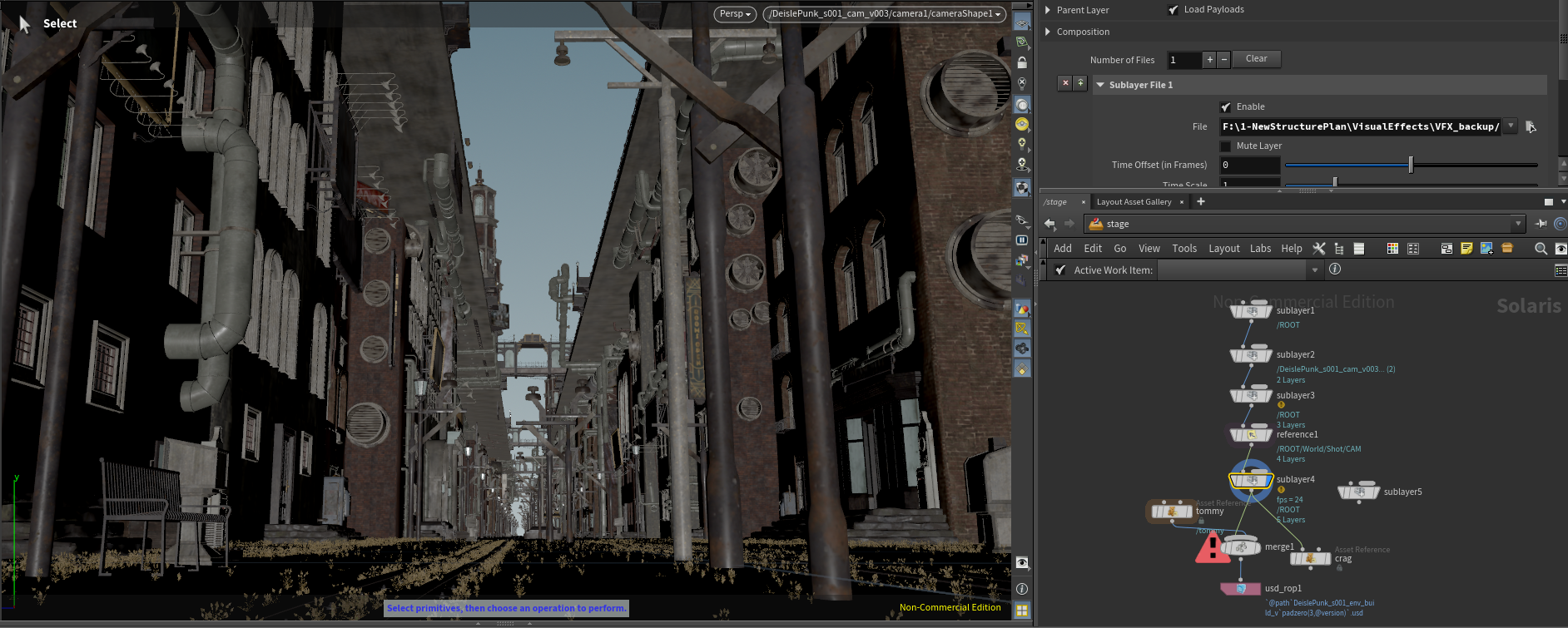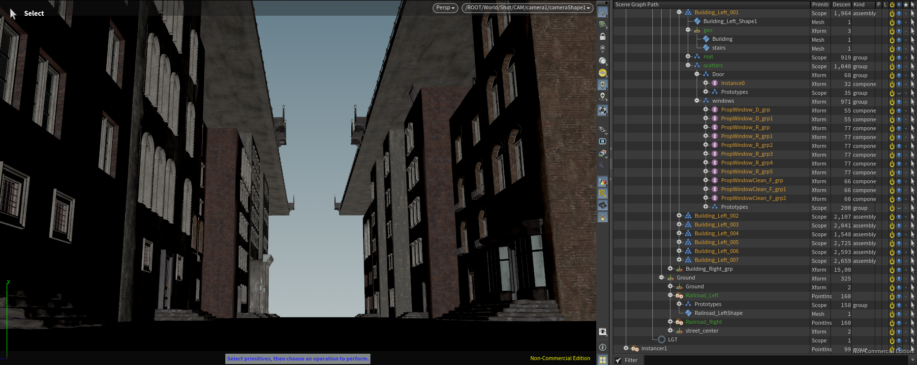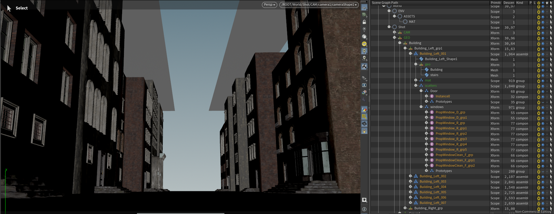 This workflow kept USD files manageable while allowing adjustments to individual components. The HDA replaced blockout geometry with references to the final assembly USD, forming the base scene. Buildings could then be instanced along a line with variation to extend the alleyway.